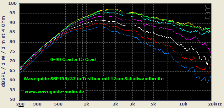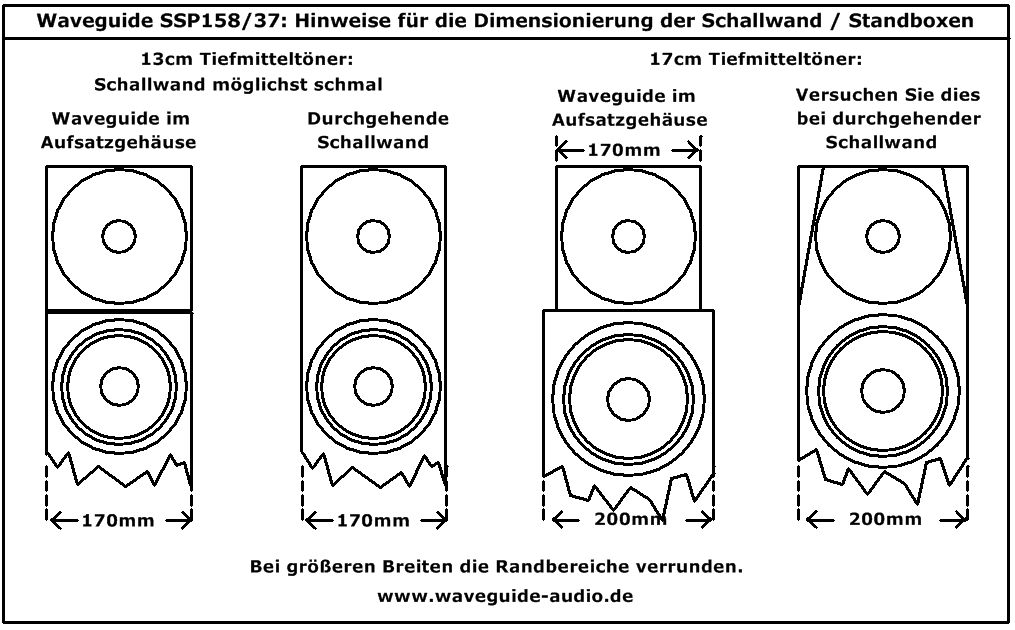 Dieses Waveguide ist entwickelt zum Einsatz mit 13cm, bez. mit 17cm Tiefmitteltönern. Aber auch mit 20cm Tiefmitteltönern lässt sich noch hervorragend gleichmäßiges Bündelungsverhalten im Bereich der Übergangsfrequenz erzielen.