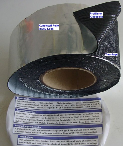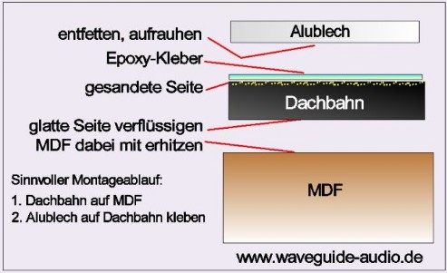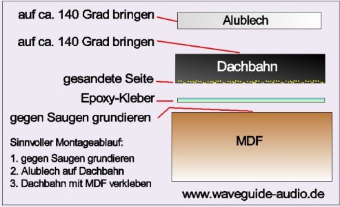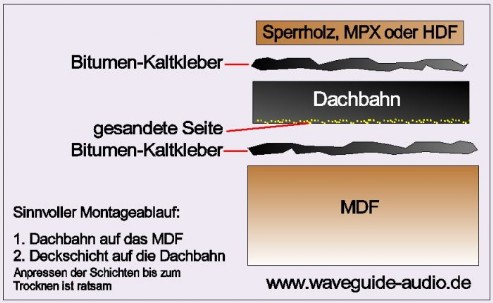 (Die Schicht mit dem Bitumen-Kaltkleber kann Tage brauchen, bis sie Dank einer saugenden Seite, auch im Kern fest ist. Solange anzupressen könnte eine gute Idee sein).