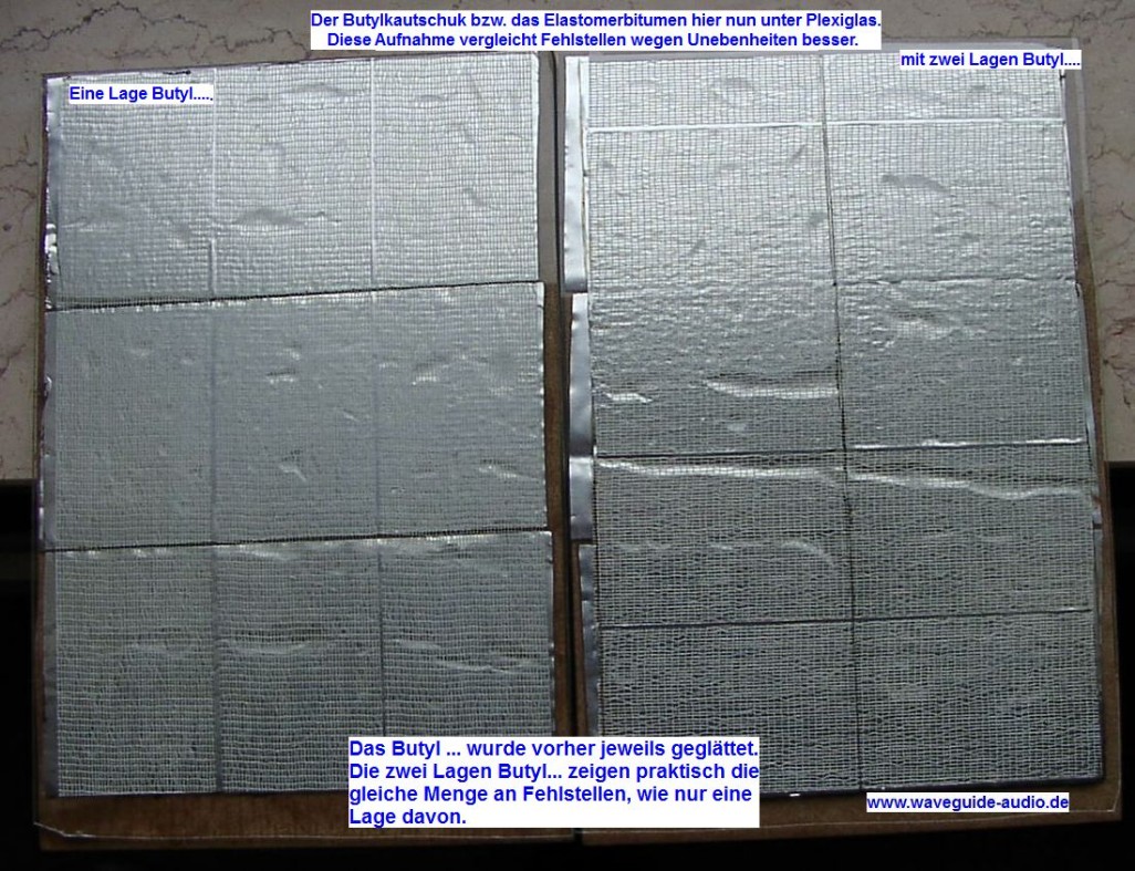 Resonanzen (bzw.: hauptsächlich deren Obertöne) die mittels einer sog. Klopfprobe angeregt werden, können durch einen Schichtaufbau aus einer Unterschicht aus Bitumex, Bitumen oder Butylkautschuk (und darauf eine Schicht typisch 2mm dickem Aluminiumbleches), gut abgebaut werden. Das Ergebnis einer Klopfprobe erscheint ganz wesentlich wertiger, wenn die Obertöne der erklopften Resonanz verhindert werden.